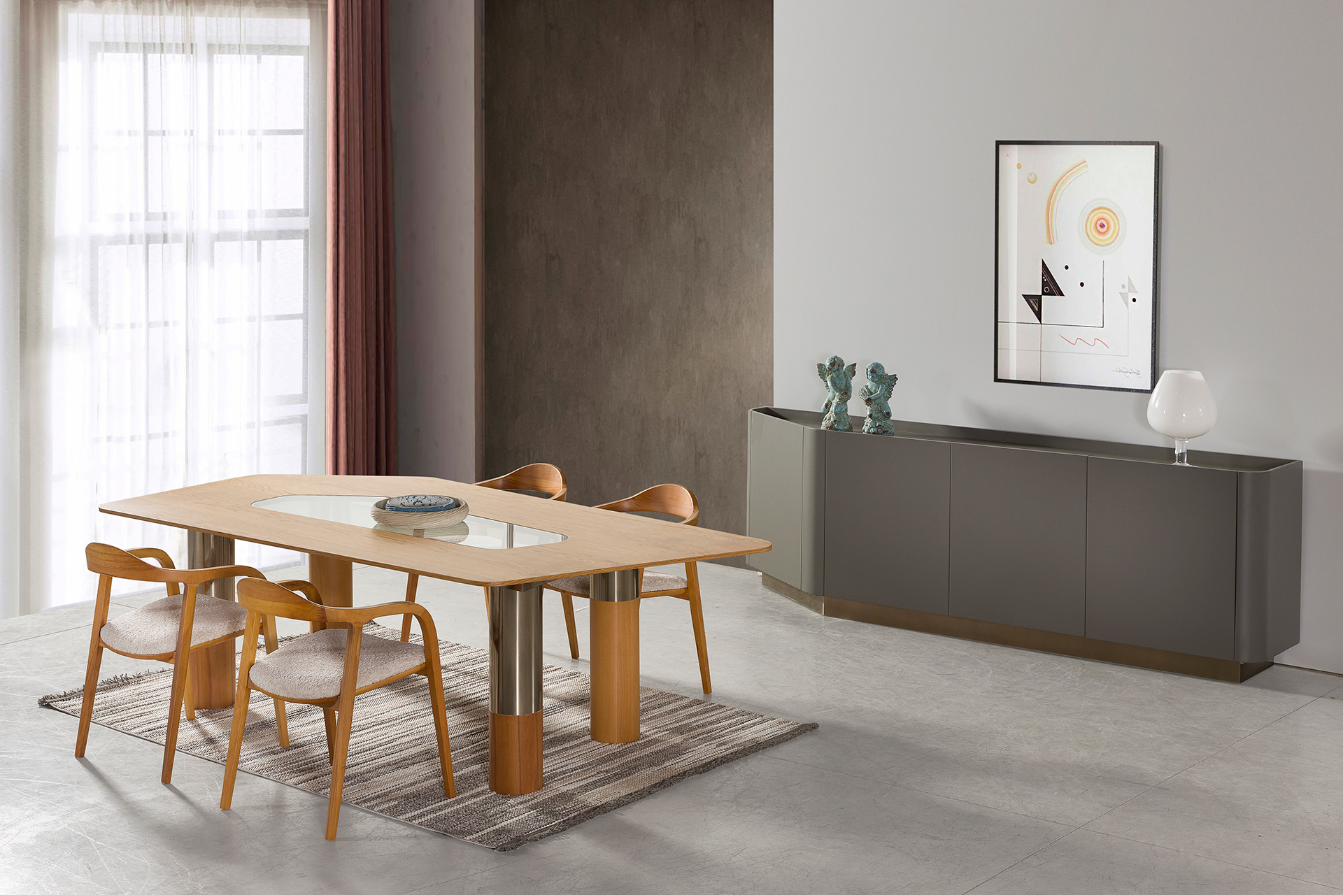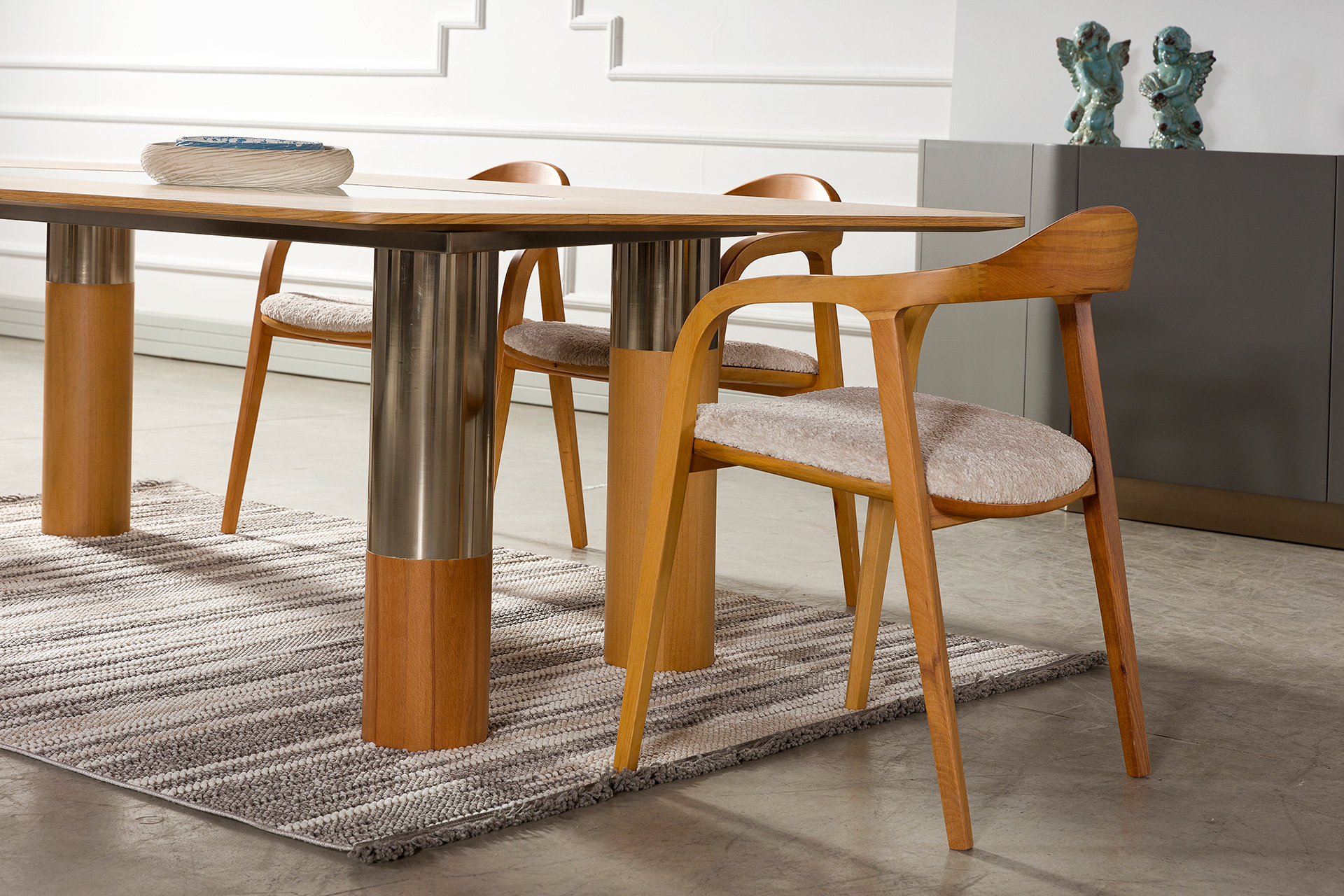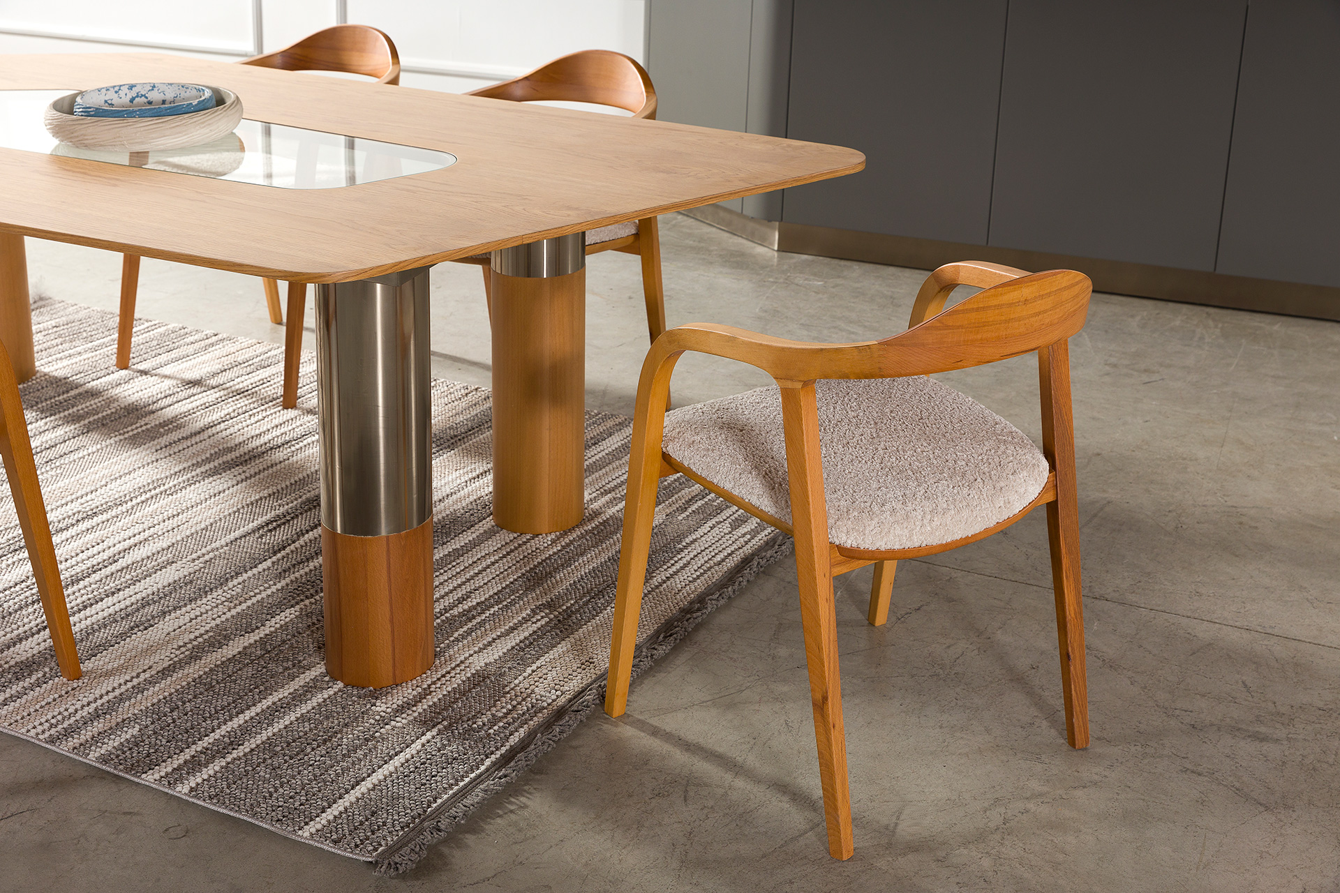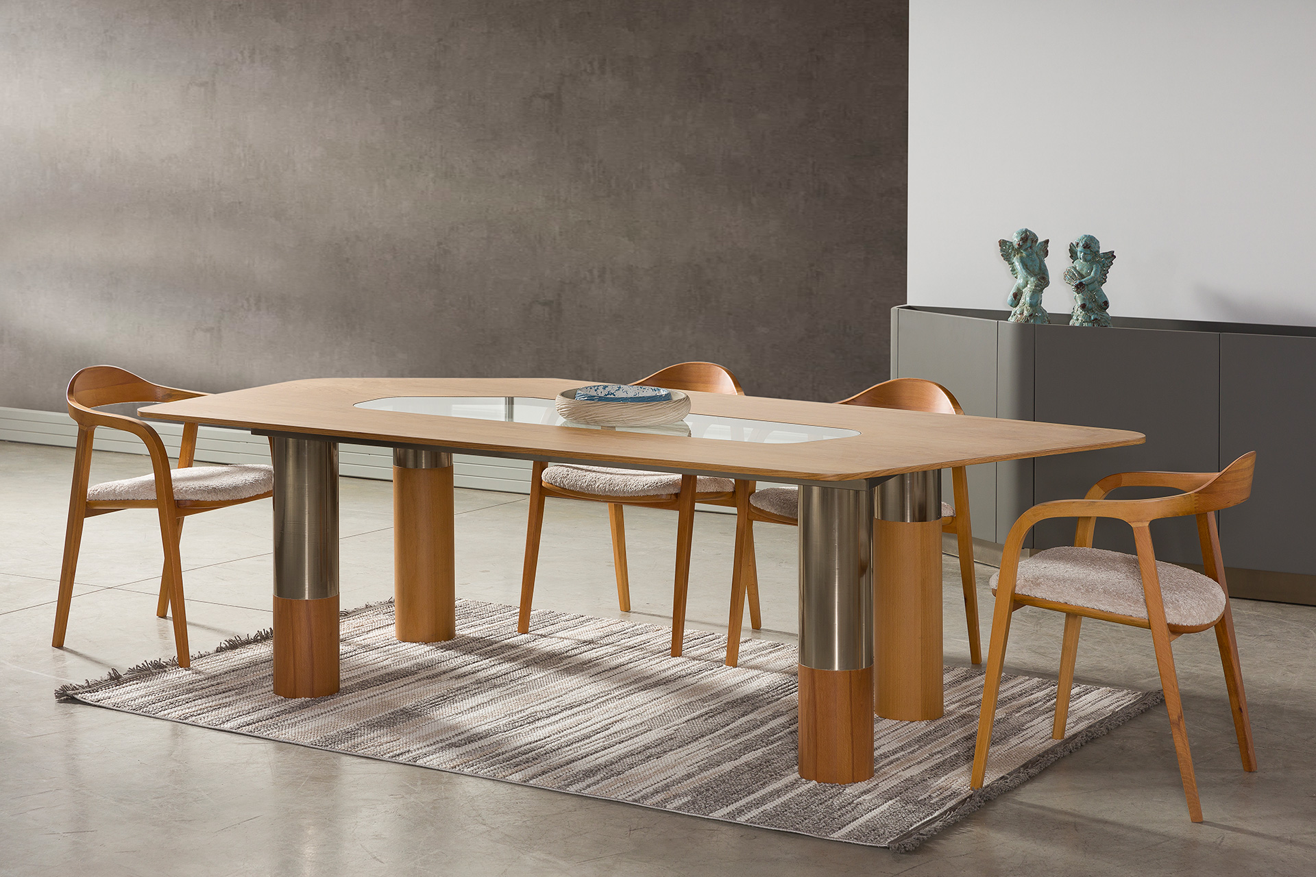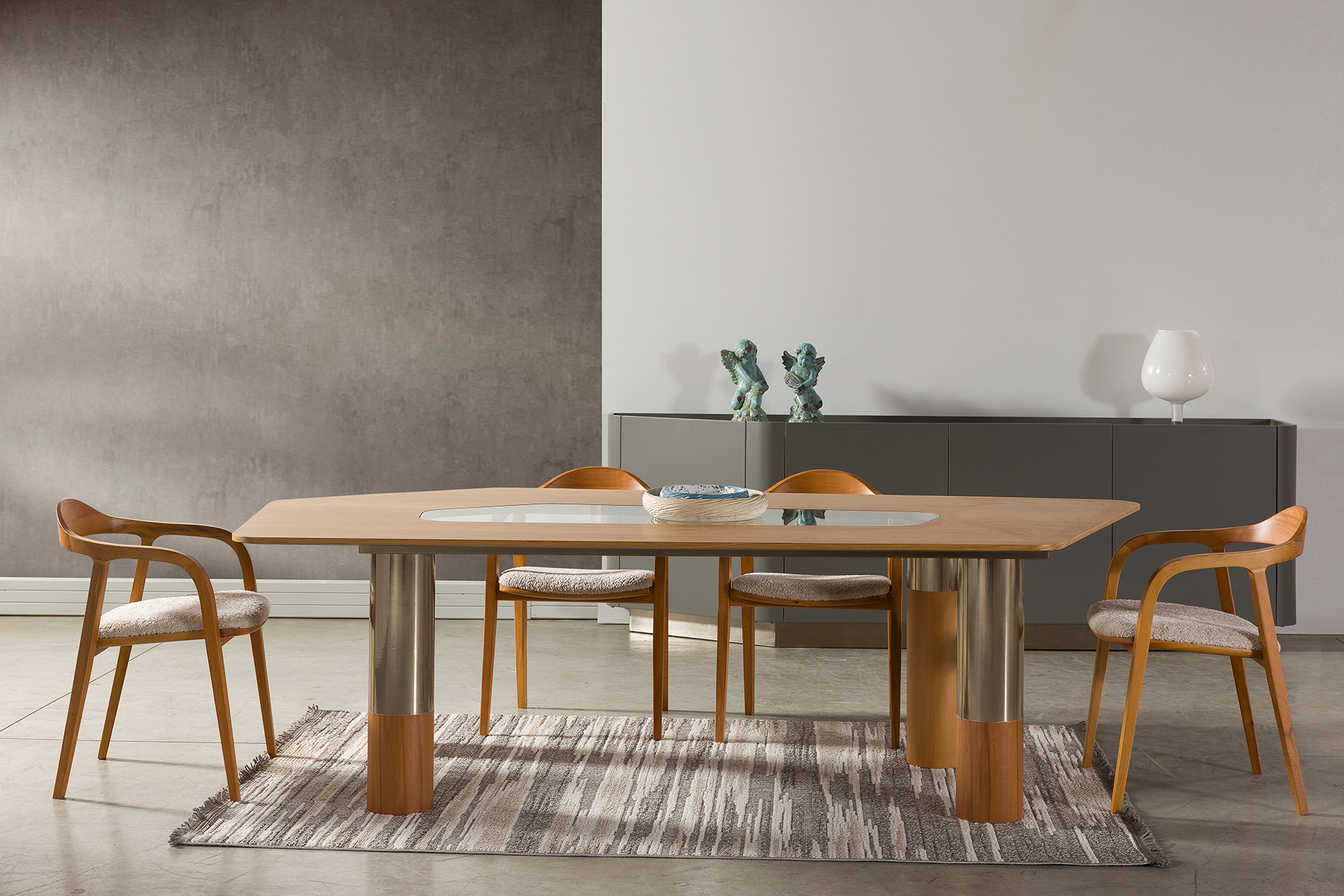 30 mm MDF üzeri doğal meşe kaplamalı üst tablası ve orta bölümde yer alan 6 mm CNC kesim temperli cam detayıyla modern şıklığı öne çıkaran ürün, metal krom kaplama ve ahşap görünümlü ayak yapısıyla estetik ile dayanıklılığı kusursuz biçimde buluşturur. Takımı tamamlayan 1. sınıf masif kayın sandalyeler ise doğal dokusu ve sağlam yapısıyla yaşam alanlarına zarif ve uzun ömürlü bir kullanım deneyimi sunar.